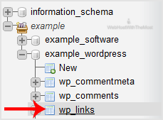 5. Select appropriate table you want to delete like If you want to delete table "wp_links" then click on it.
