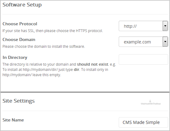• In Directory: If you want to install this in a directory, for example example.com/directory, enter the directory name. Otherwise, leave this blank to install in your main domain example.com