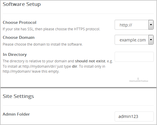 • In Directory: If you want to install this in a directory, for example example.com/directory, enter the directory name. Otherwise, leave this blank to install in your main domain example.com